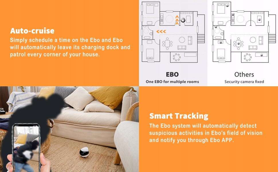 Dzięki funkcjom śledzenia EBO jest idealnym robotem do ochrony domu, który chroni Twój dom i informuje o wykryciu podejrzanej aktywności.