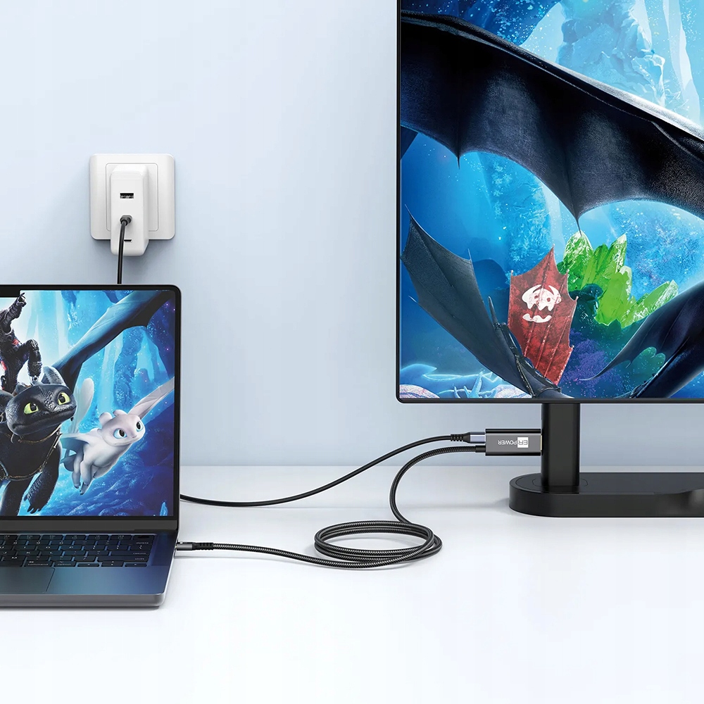 Kabel USB-C do HDMI ERPOWER DisplayPorter łączy przesył szczegółowego obrazu 4K UHD 60 Hz z HDR z jednoczesnym ładowaniem USB-C Power Delivery do 100W, dzięki czemu jedno akcesorium obsługuje ekran oraz zasilanie sprzętu. Dodatkowe wejście USB-C przy złączu HDMI umożliwia podpięcie ładowarki sieciowej i doładowanie urządzenia wysyłającego obraz bez przerywania pracy lub rozrywki, co sprawdza się podczas filmów, grania i wielozadaniowej pracy biurowej.