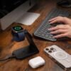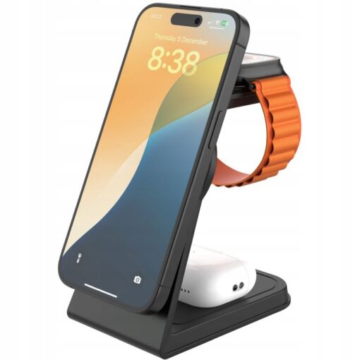 Masz iPhone’a, Apple Watcha i AirPodsy? Świetnie się składa – ta stacja obsłuży je wszystkie jednocześnie, w dodatku bez jednego kabla w zasięgu wzroku. Wbudowane magnesy trzymają iPhone jak najlepszy kumpel po siłowni, a ładowanie do 15 W z technologią Qi2 to nie tylko szybko, ale i chłodno. Apple Watch? Bez dodatkowych kabli, bez kombinowania. AirPodsy? Po prostu je odłóż. Gotowe.