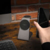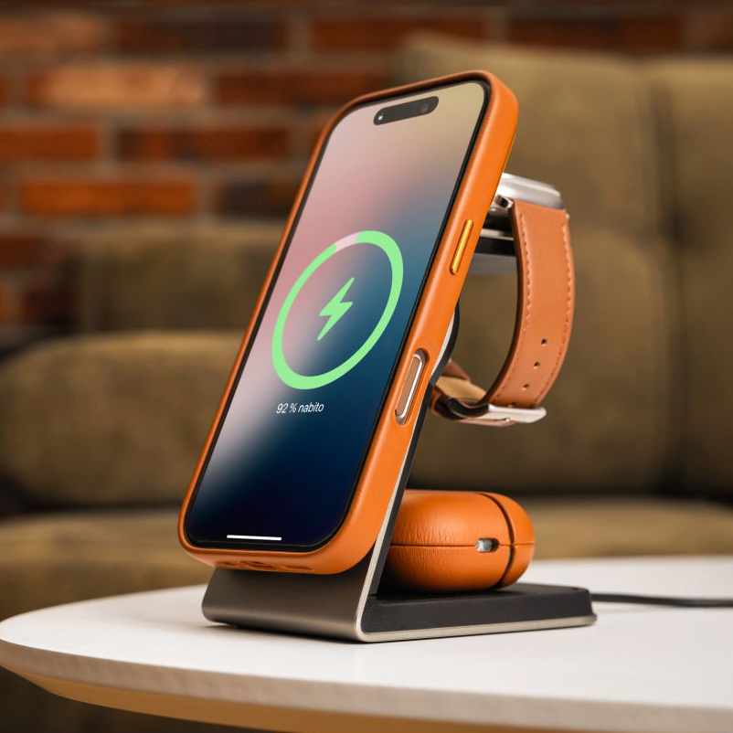Trzecia powierzchnia tej ładowarki zadba o Apple Watch – bez potrzeby dodatkowych kabli czy specjalnych stojaków. Wbudowana ładowarka oferuje 2,5 W mocy, wystarczając do codziennego ładowania zegarka. Silikonowa powierzchnia przyjmuje urządzenie łagodnie jak poduszka. Stacja idealnie wpasowuje się w rytm nocnego ładowania – wieczorem odkładasz, rano zakładasz. A wszystko w jednym miejscu.